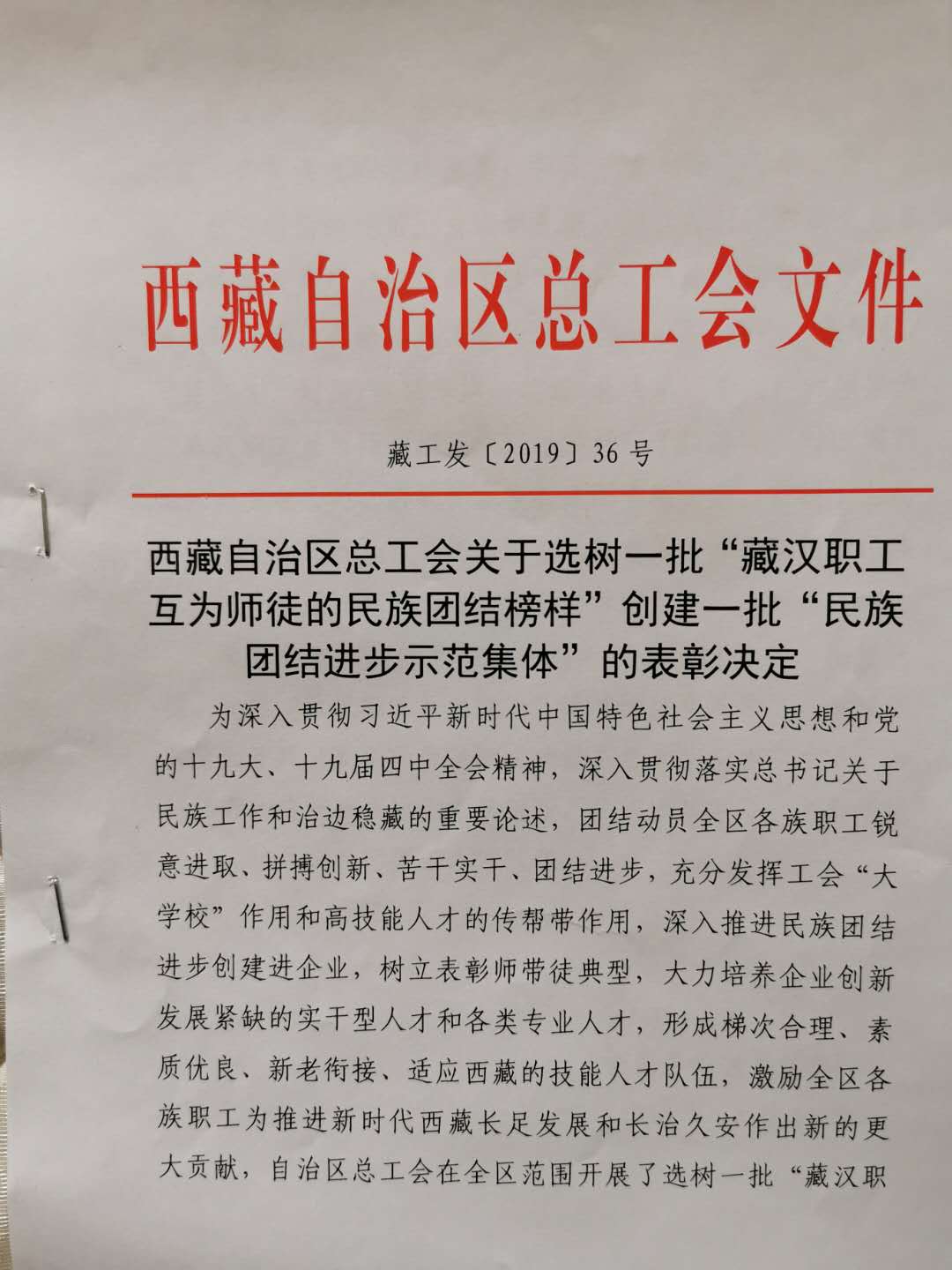 西藏自治區(qū)總工會(huì)關(guān)于選樹一批 "藏漢職工互為師徒的民族團(tuán)結(jié)榜樣 "創(chuàng)建一批 "民族團(tuán)結(jié)進(jìn)步示范集體 "的表彰決定