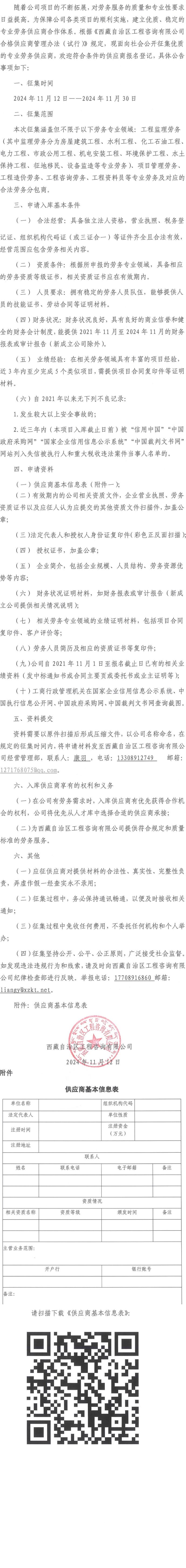 西藏自治區(qū)工程咨詢有限公司專業(yè)勞務供應商入庫征集公告