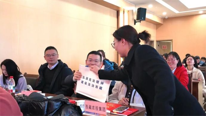 活動現(xiàn)場,一系列內(nèi)容豐富、形式新穎的環(huán)節(jié)有序開展。參會人員集中觀看了憲法精神主題影片及“憲法進企業(yè)”主題紀錄片,直觀感受憲法的崇高權威與實踐力量;活動特邀西藏歐珠律師事務所律師歐珠永青作《憲法》專題講座,深入淺出解讀憲法核心要義與依法治企實踐路徑,充分闡釋了新時代《憲法》的新發(fā)展,引發(fā)廣泛共鳴;憲法趣味有獎問答互動環(huán)節(jié)氛圍熱烈,有效調(diào)動了干部職工學法用法的積極性;活動還設置了現(xiàn)場法律咨詢環(huán)節(jié),幫助干部職工解決工作生活中遇到的法律問題,號召大家爭做“學法先鋒、守法模范、用法表率”。