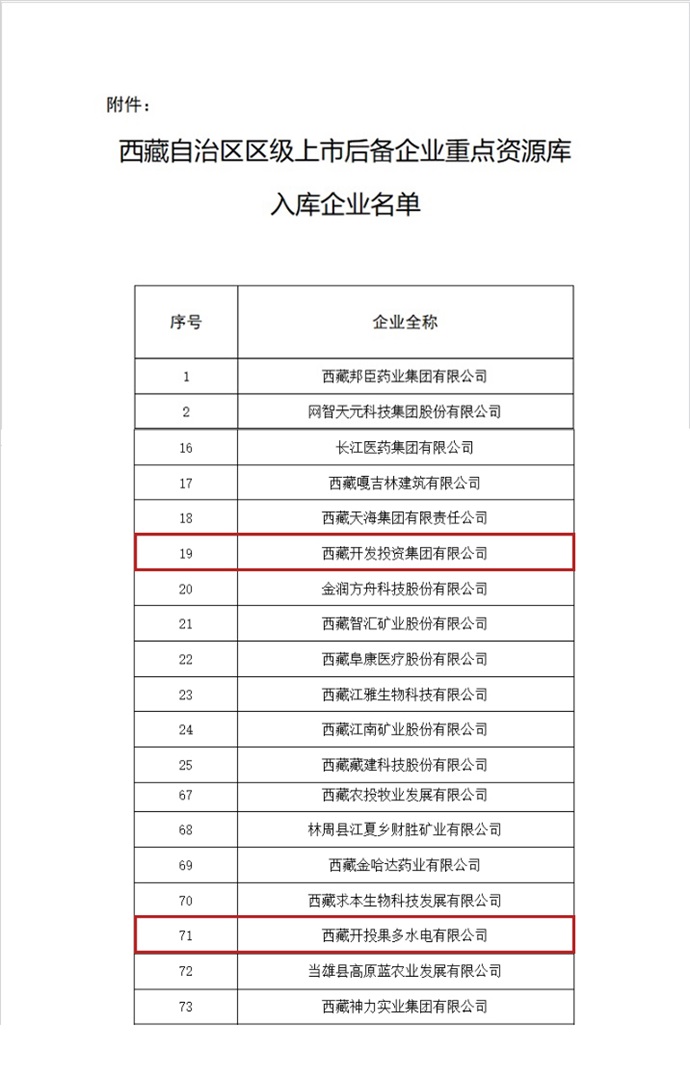 西藏開發(fā)投資集團和西藏開投果多水電成功入選上市后備企業(yè)資源庫
