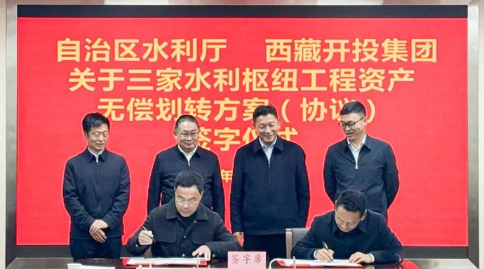 12月11日,自治區(qū)水利廳與西藏開(kāi)投集團(tuán)在拉薩簽署旁多、滿拉、拉洛三大水利樞紐工程資產(chǎn)無(wú)償劃轉(zhuǎn)協(xié)議,標(biāo)志著西藏國(guó)有企業(yè)改革邁出堅(jiān)實(shí)步伐。自治區(qū)水利廳黨組副書記、廳長(zhǎng)和忠華,區(qū)政府國(guó)資委黨委委員、副主任于雷,西藏開(kāi)投集團(tuán)黨委書記、董事長(zhǎng)祁騰武出席簽字儀式并講話。自治區(qū)水利廳黨組成員、副廳長(zhǎng)趙輝與西藏開(kāi)投集團(tuán)黨委委員、副總經(jīng)理尼瑪代表雙方簽署協(xié)議。集團(tuán)領(lǐng)導(dǎo)羅布次仁、陳焱罡出席儀式。