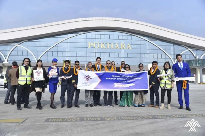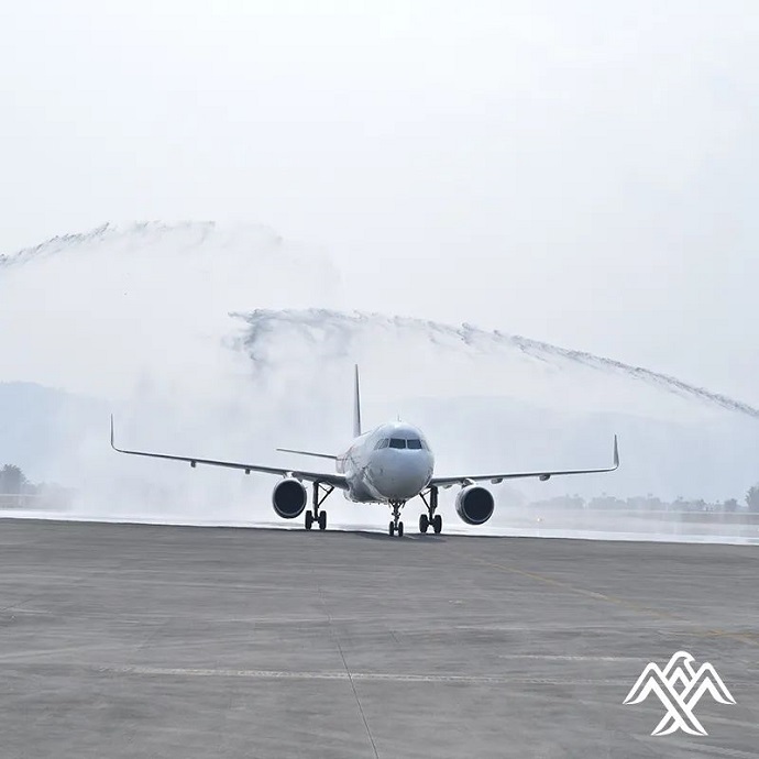 首次亮相在博卡拉國(guó)際機(jī)場(chǎng)的喜航客機(jī),穿過(guò)象征民航最高禮儀的“水門(mén)”,受到隆重歡迎。此架飛機(jī)隨后于15時(shí)44分起飛,于16時(shí)17分返回加德滿都。