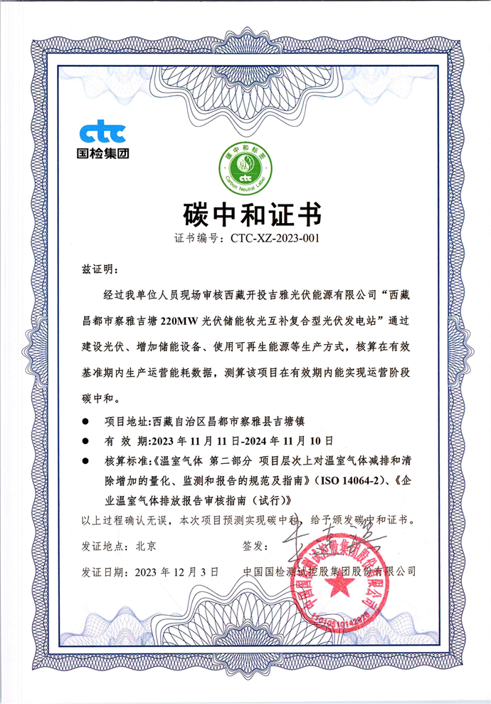 CTC國(guó)檢為吉塘200MW項(xiàng)目頒發(fā) “碳中和”證書(shū)