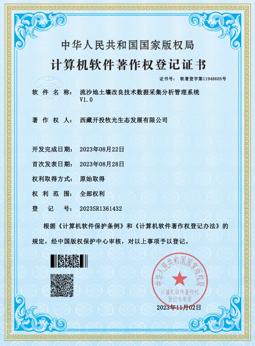 經(jīng)過一年多的摸索,西藏開投在拉薩南北山綠化工程項(xiàng)目形成了豐富的技術(shù)成果,于近日成功申報(bào)獲取了1項(xiàng)實(shí)用新型專利和5項(xiàng)計(jì)算機(jī)軟件著作權(quán)。分別是《一種流沙地土壤有機(jī)肥混合裝置》實(shí)用新型專利和《土壤改良種植技術(shù)項(xiàng)目實(shí)施進(jìn)度跟蹤管理系統(tǒng)V1.0》《流沙地土壤改良技術(shù)數(shù)據(jù)采集分析管理系統(tǒng)V1.0》《流沙地土壤改良農(nóng)業(yè)資源調(diào)度管理軟件V1.0》《荒山種植噴灌施工計(jì)劃數(shù)字化管理系統(tǒng)V1.0》《荒山種植噴灌施工智能化控制管理軟件V1.0》計(jì)算機(jī)軟件著作權(quán)。