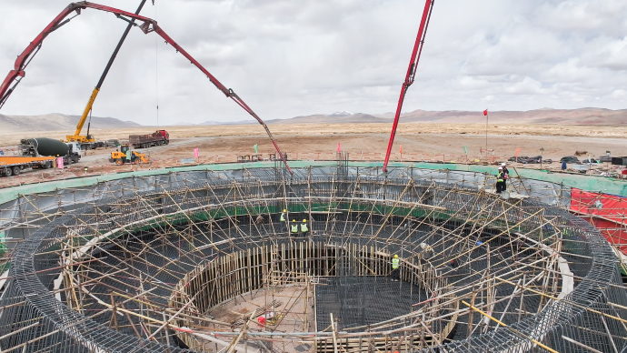 安多土碩光熱光伏一體化項目聚光集熱塔基礎(chǔ)完成第一倉混凝土澆筑。趙苑余 攝