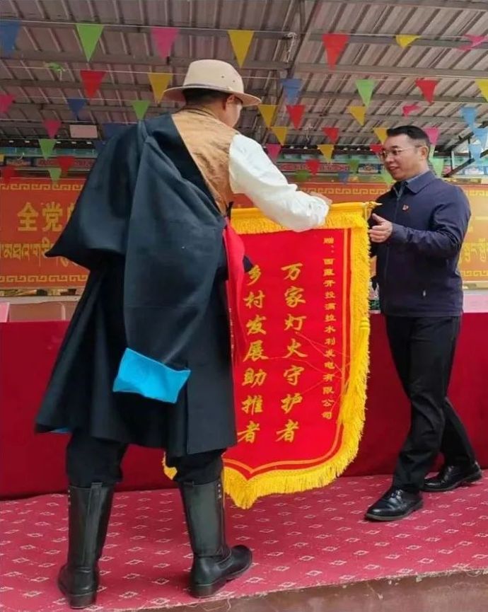 7月20日,江孜縣龍馬鄉(xiāng)加熱村載歌載舞喜迎西藏自治區(qū)成立60周年,西藏開投滿拉水電公司干部職工受邀參與。為了表達(dá)對公司長期以來幫助與關(guān)懷的感激之情,江孜縣龍馬鄉(xiāng)人民政府駐村工作隊(duì)及加熱村村委會向滿拉水電公司贈(zèng)送了一面印有“萬家燈火守護(hù)者 鄉(xiāng)村發(fā)展助推者”字樣的紅色錦旗。