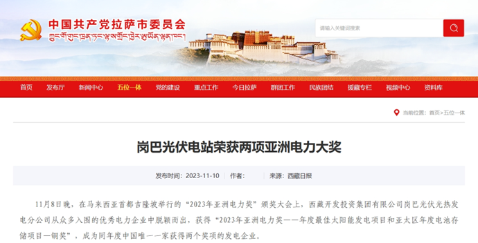 科技日?qǐng)?bào)、西藏日?qǐng)?bào)、西藏日?qǐng)?bào)客戶端等多個(gè)媒體報(bào)道了《西藏開發(fā)投資集團(tuán)有限公司崗巴光伏電站榮獲2023年度兩項(xiàng)亞洲電力大獎(jiǎng)》