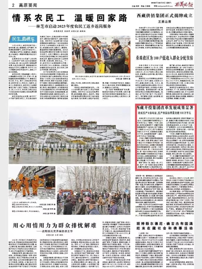 編者按:12月9日,西藏日?qǐng)?bào)第二版高原要聞欄目報(bào)道了《西藏開投集團(tuán)改革發(fā)展成果顯著建成投產(chǎn)9座電站,投產(chǎn)總裝機(jī)容量突破100萬千瓦》文章。全文如下: