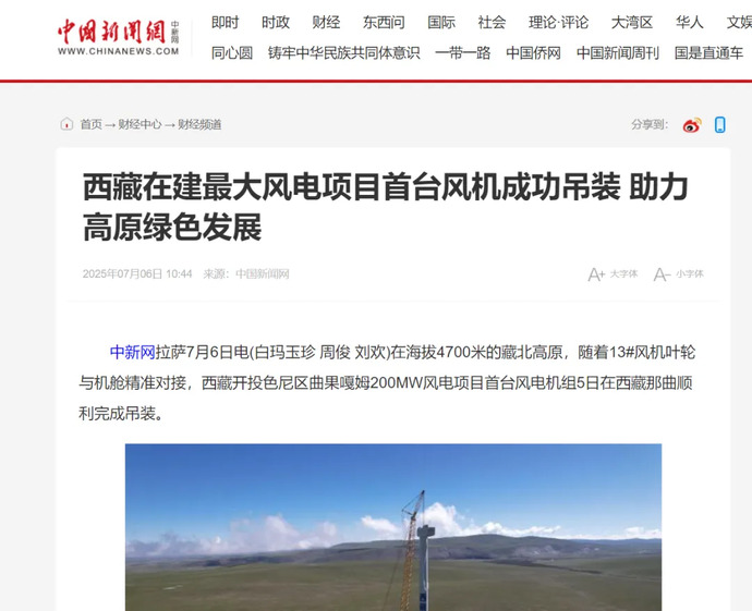 媒體報道丨西藏在建最大風(fēng)電項目完成首臺風(fēng)力發(fā)電機組吊裝