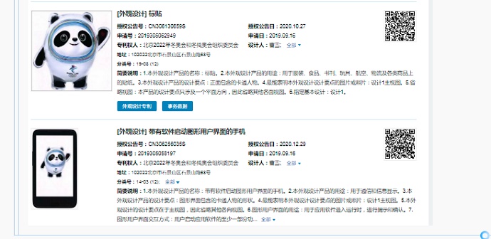 2019年9月,北京冬奧組委向國(guó)家知識(shí)產(chǎn)權(quán)局提交了4件與冰墩墩相關(guān)的外觀設(shè)計(jì)專利,并于2020年獲得授權(quán)。