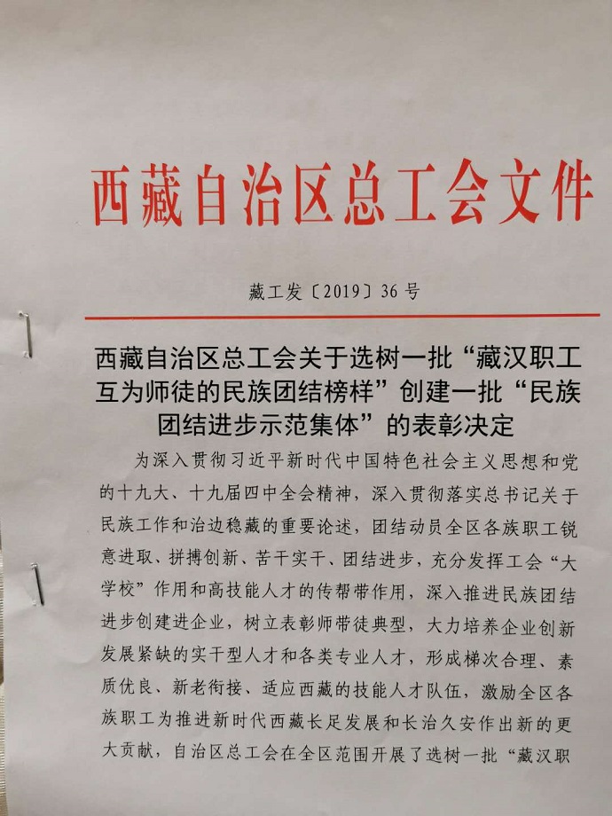 西藏自治區(qū)總工會(huì)關(guān)于選樹一批"藏漢職工互為師徒的民族團(tuán)結(jié)榜樣"創(chuàng)建一批"民族團(tuán)結(jié)進(jìn)步示范集體"的表彰決定