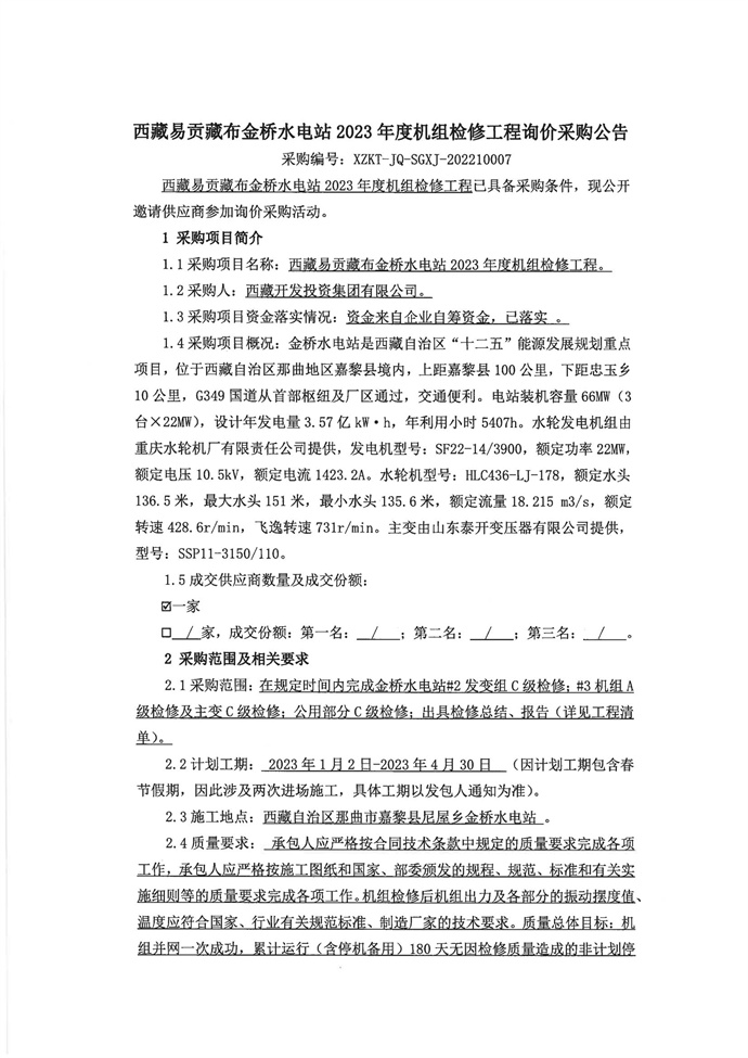 西藏易貢藏布金橋水電站2023年度機組檢修工程詢價采購公告