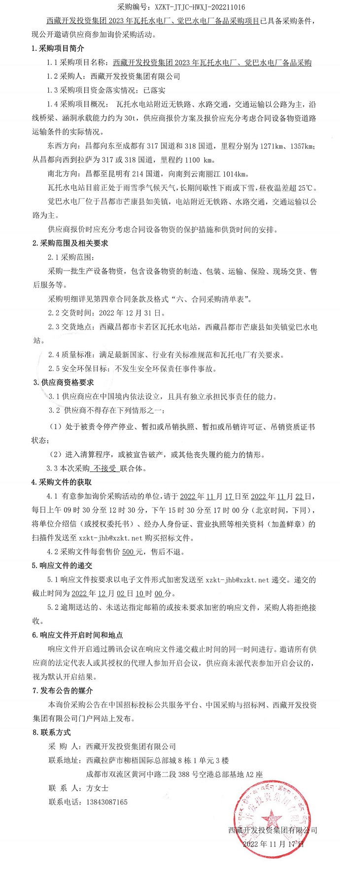 西藏開發(fā)投資集團(tuán)2023年瓦托水電廠、覺巴電廠備品采購(gòu)公告
