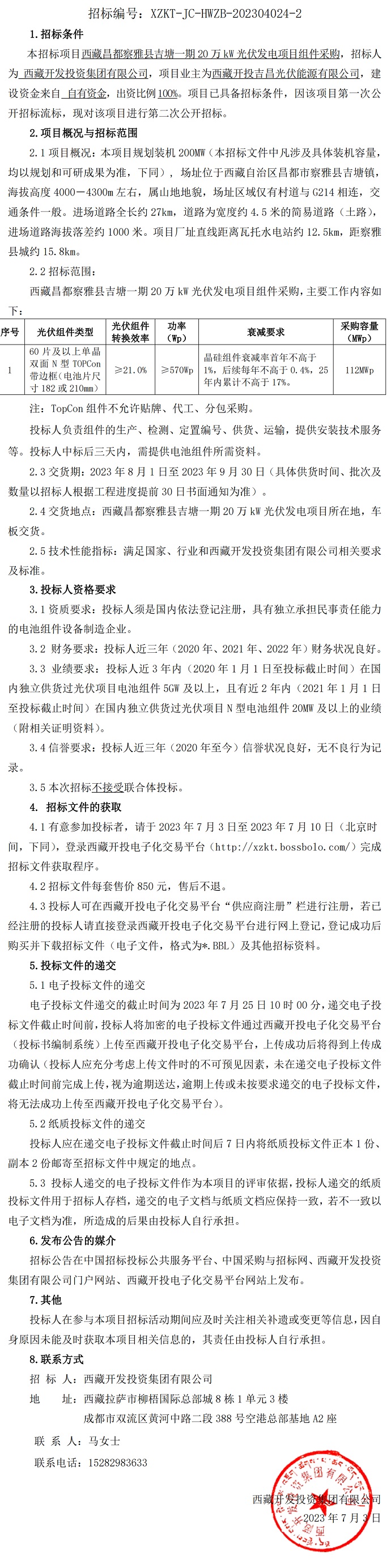 西藏昌都察雅縣吉塘一期20萬(wàn)kW光伏發(fā)電項(xiàng)目組件采購(gòu)
