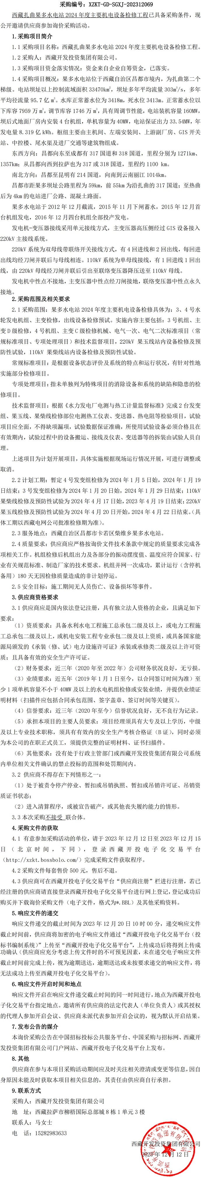 西藏扎曲果多水電站2024年度主要機(jī)電設(shè)備檢修工程詢價采購公告