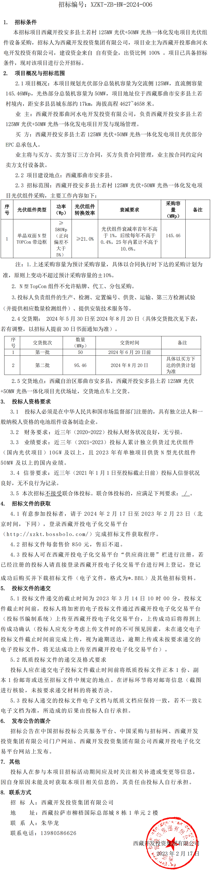 西藏開投安多縣土若村125MW光伏+50MW光熱一體化發(fā)電項目光伏組件設備采購招標公告