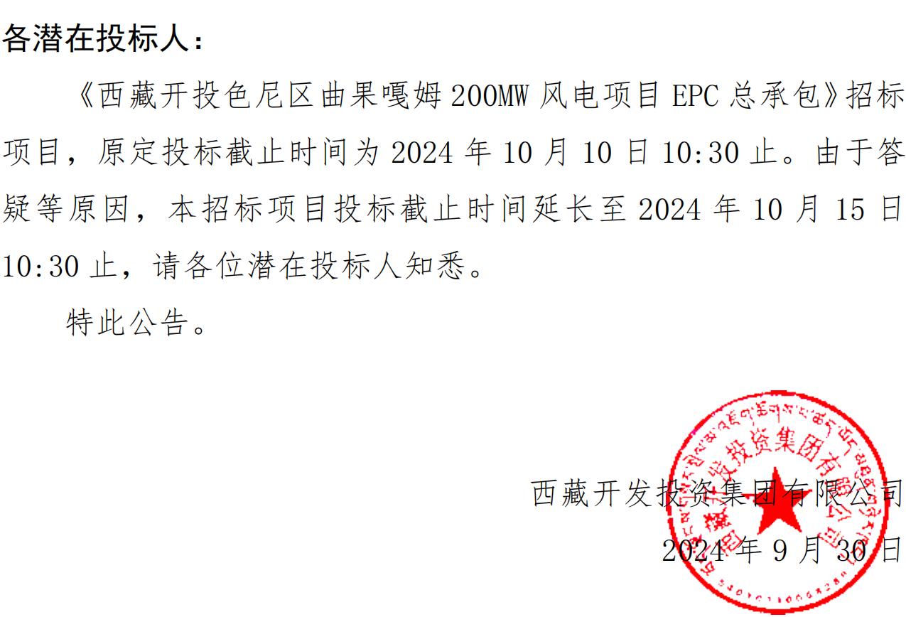 關(guān)于延長《西藏開投色尼區(qū)曲果嘎姆200MW風(fēng)電項目EPC總承包》投標(biāo)截止時間的公告