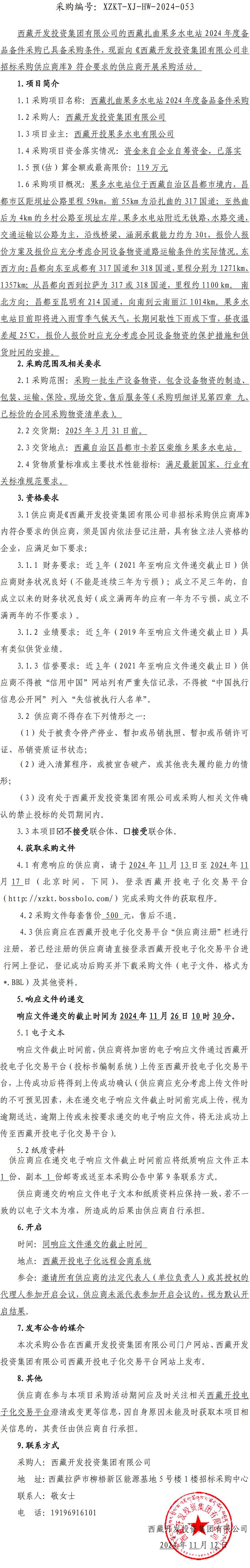 西藏扎曲果多水電站 2024 年度備品備件采購詢價(jià)采購公告
