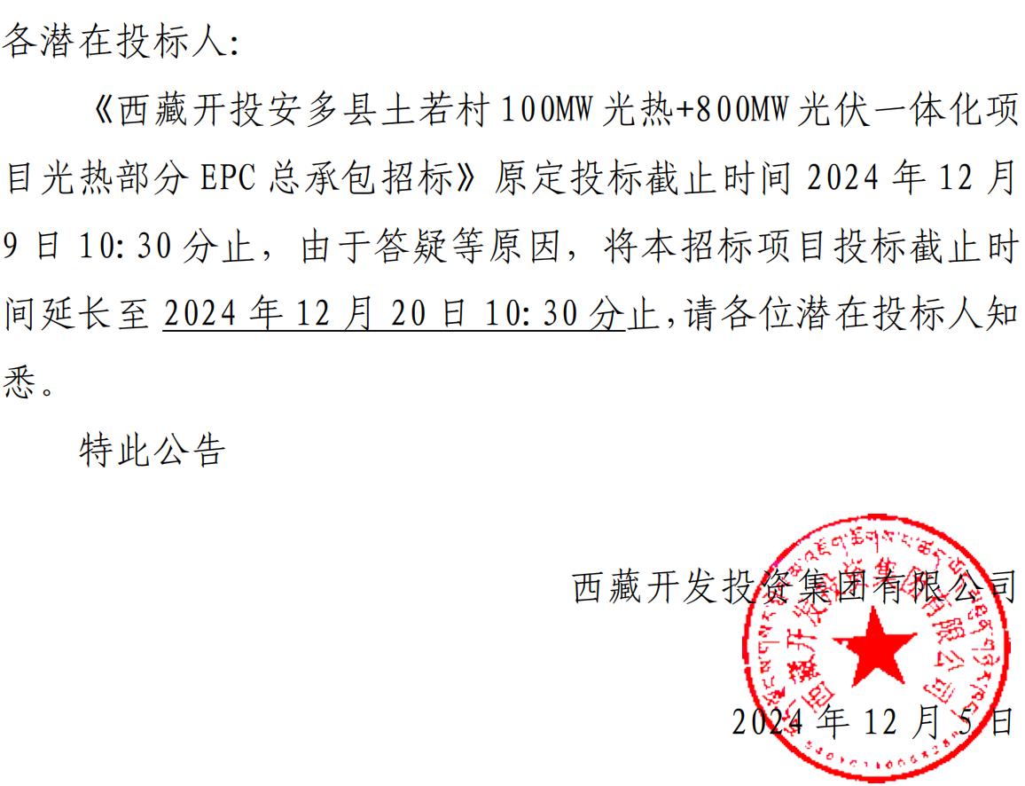 關(guān)于延長《西藏開投安多縣土碩 100MW 光熱+800MW 光伏一體化項(xiàng)目光熱部分 EPC 總承包招標(biāo)》投標(biāo)截止時(shí)間的公告