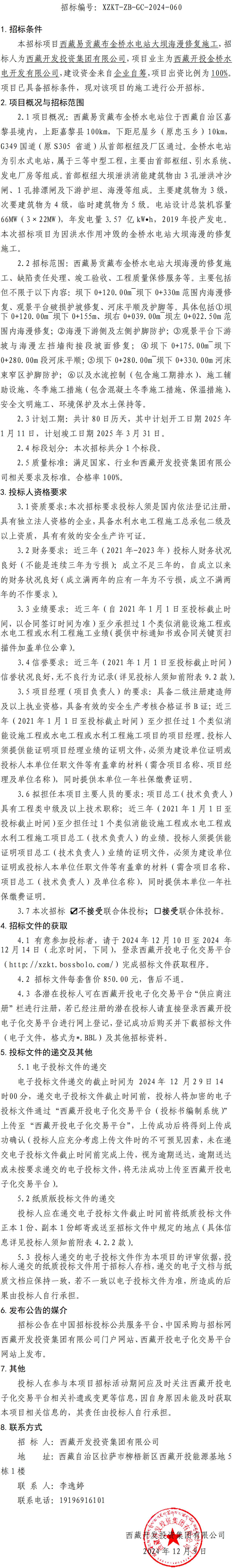 西藏易貢藏布金橋水電站大壩海漫修復施工招標公告